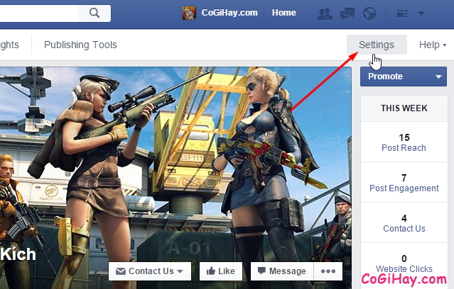 Trước hết hãy vào Facebook.com để đăng nhập vào tài khoản facebook. Sau đó là tài khoản quản trị Fanpage mà bạn muốn xoá. Truy cập vào Fanpage và chọn vào mục Settings trên phần đầu của Fanpage bạn. (Nếu bạn đang sử dụng facebook tiếng việt thì vào phần “Thiết lập”).