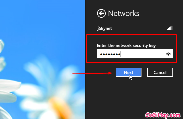 Khi chương trình hiện thông báo “Enter the network security key” bạn điền mật khẩu Wifi của bạn vào rồi nhấn nút “Next” để bắt đầu kết nối: