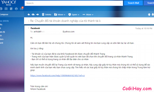– Bây giờ việc cần làm là chờ đợi Facebook giải quyết, nếu sau 1 ngày bạn không thấy Email thông báo thành công từ Facebook thì bạn lại làm lại các bước ở trên thêm 1 lần nữa, Admin CoGiHay.com phải làm tới 2 lần mới thành công đấy – cái này là mẹo nha, vì facebook bận nên đôi khi không để ý tới yêu cầu của bạn.